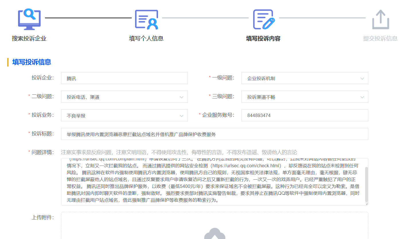 举报腾讯使用内置浏览器恶意拦截站点域名并借机推广品牌保护收费服务,言简意赅。 - 问题详情则是详细论述腾讯的恶心操作。注意正确反映问题,用语文明。以下提供本人编写的案例: