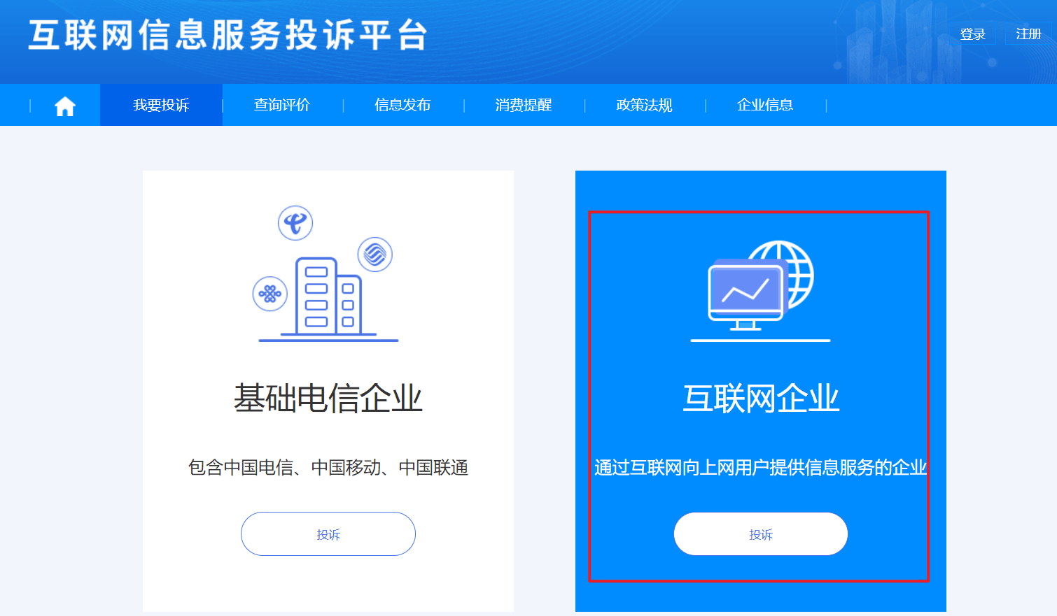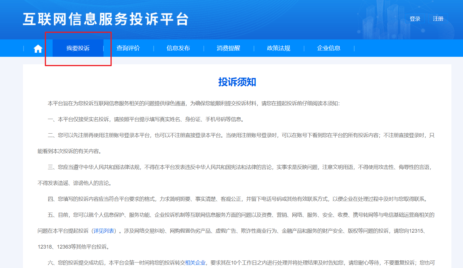 - 进入互联网信息服务投诉平台,选择我要投诉,拉到最下,勾选我已阅读投诉须知并同意隐私政策,待倒计时结束后点击最下方的我要投诉