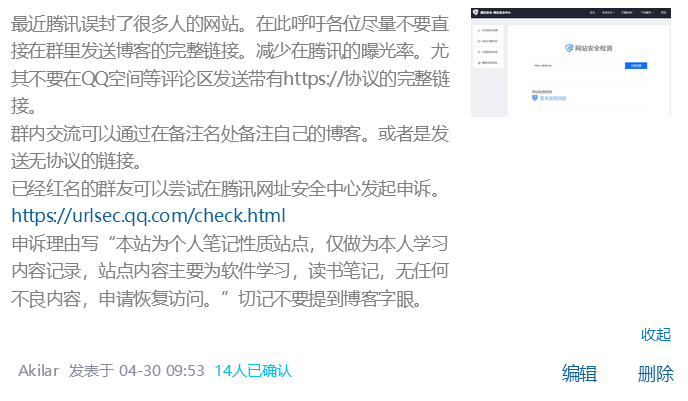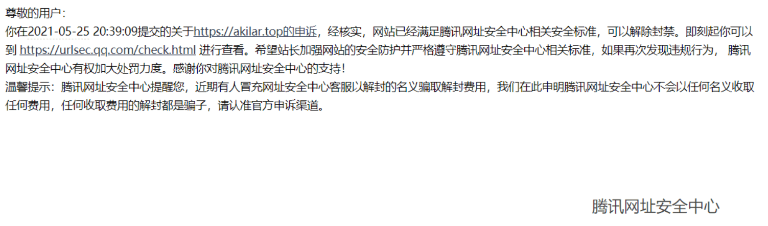 当时也并未如何在意,毕竟在我之前,被误封站点的博主,我多少还是有见过一些的。之后借助腾讯提供的申诉渠道:腾讯安全-网址安全中心进行申诉,效率还算快,当天申诉,隔天就能正常访问了。