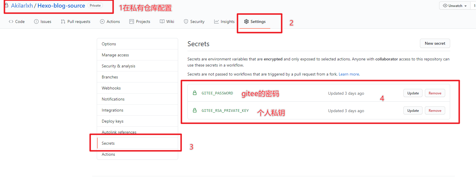 因为github action使用的是美国的服务器,所以,使用github action来远程更新gitee的站点部署时,会收到异地登陆的短信,提示需要验证码。这个在脚本作者的issues里有相应的解决方案:登陆失败 #6- 在微信上搜索Gitee微信公众号,在微信公众号内绑定自己的Gitee账号,这样虽然还是会有异地登录提示,但是发过来的消息不再需要填写验证码,而且提醒若不是你在操作,请及时修改密码。(某种意义上就是我在操作,所以我选择不改密码2333)