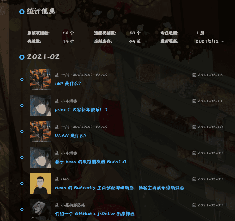 应援@冰卡诺老师的友链朋友圈项目。进行pjax适配。沿用了Butterlfy的时间轴样式。